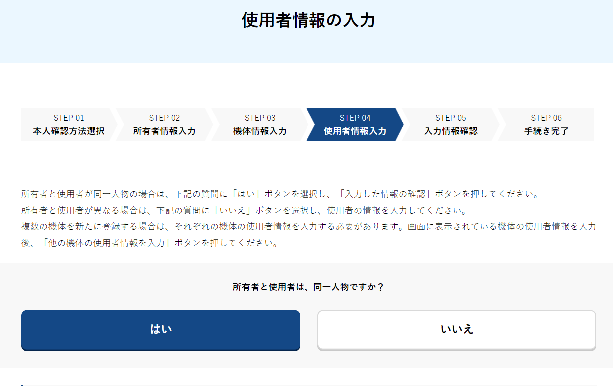 所有者と使用者が同一の場合は「はい」をチェックしてください。「いいえ」を押すと使用者の名前や連絡先などの個人情報を入力する欄が開きます。