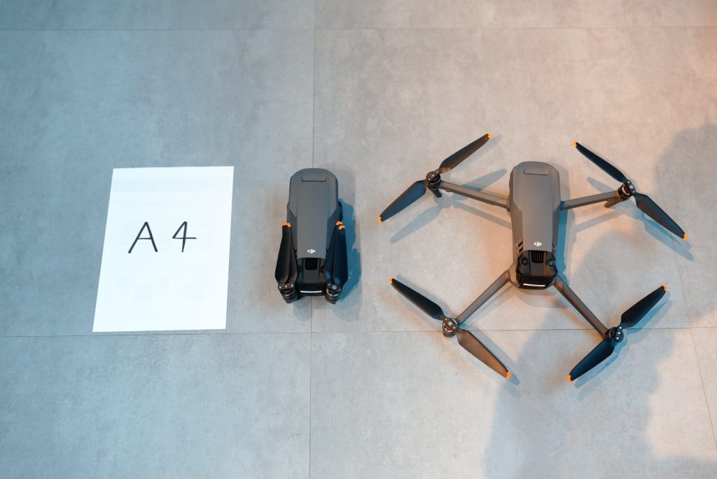 左からA4コピー用紙、畳んだ DJI Mavic 3、展開した DJI Mavic 3 です。
