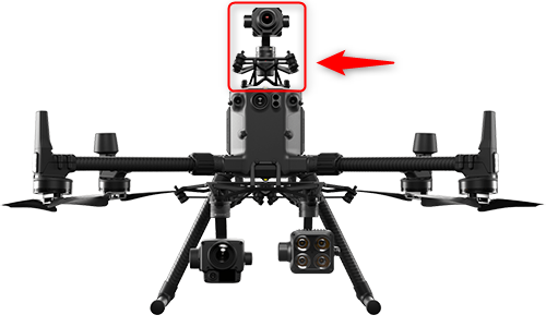 追加のアクセサリを使うことで、カメラを機体の真上に設置することもできます。真上の撮影にはこちらの上方ジンバルコネクターが必要ですが、こんな使い方ができるのは DJI機の中でも M300 RTK だけです。