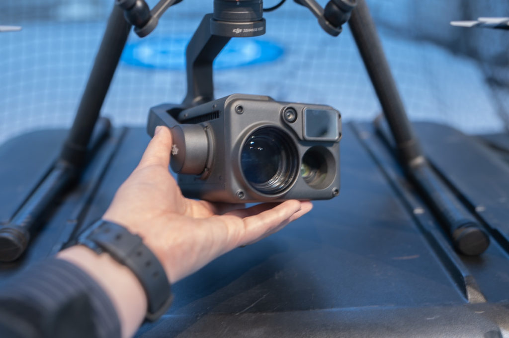 M300 RTK には、温度を可視化できる赤外線カメラ付きの Zenmuse H20T やレーザー測量機の Zenmuse L1、フルサイズセンサー搭載で4500万画素を誇る Zenmuse P1 など、対応しているカメラが複数あります。下の写真は Zenmuse H20T です。