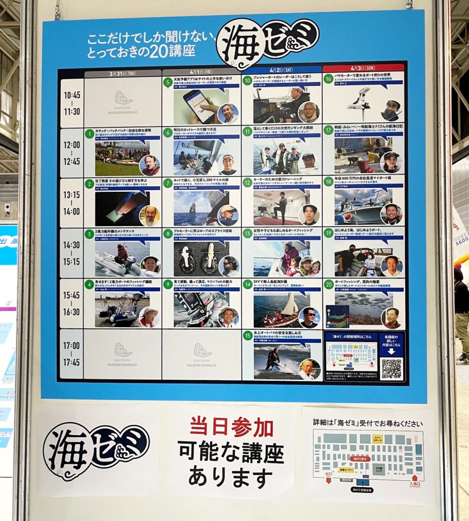 また、いわゆる企業の展示だけではなく、「海ゼミ」という講座が開かれていました。マリンフォトやボートフィッシングはもちろん、天気予報アプリの使い分けや料理包丁の使いこなし方まで、講座の内容は多岐にわたっています。興味深いですね。
