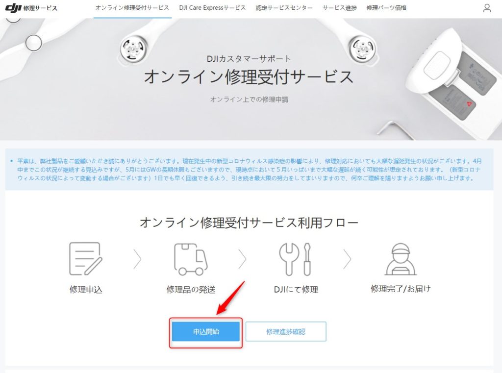 DJIでの修理申し込みは、こちらのリンクから下記の案内にそってご依頼ください。