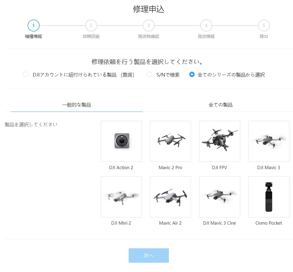 点検に出したい機体を入力します。シリアルナンバーから検索できるほか、製品シリーズ名から申し込みを進めることもできます。製品情報を入力し、[次へ]をクリックします。
