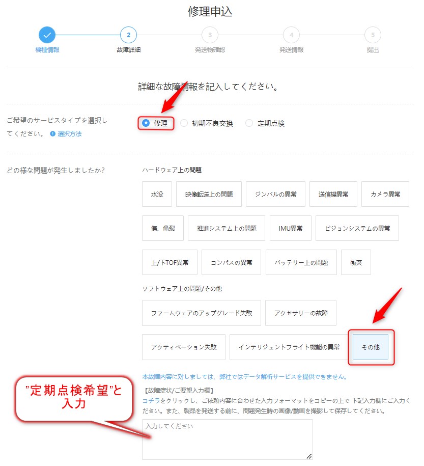 「故障詳細」のところでは[修理]を選びます。[その他]にチェックを入れると自由入力欄が開きますので、「定期点検希望」であることを入力してください。ほかに要望があればあわせて打ち込んでおきましょう。