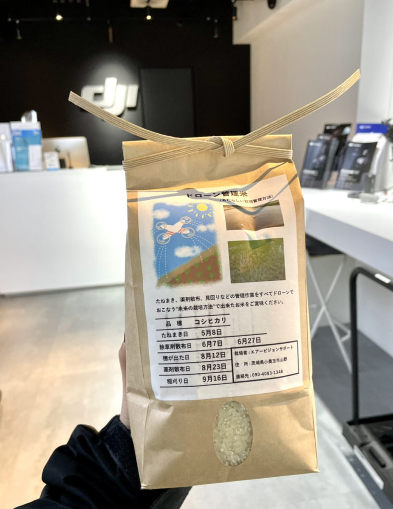 ドローン管理米とは、「たねまき、薬剤散布、見回りなどの管理作業をすべてドローンで行う“未来の栽培方法”でできたお米」です。なんだか最新のテクノロジーを感じる説明ですね。
