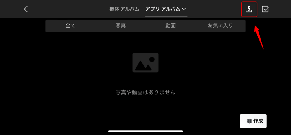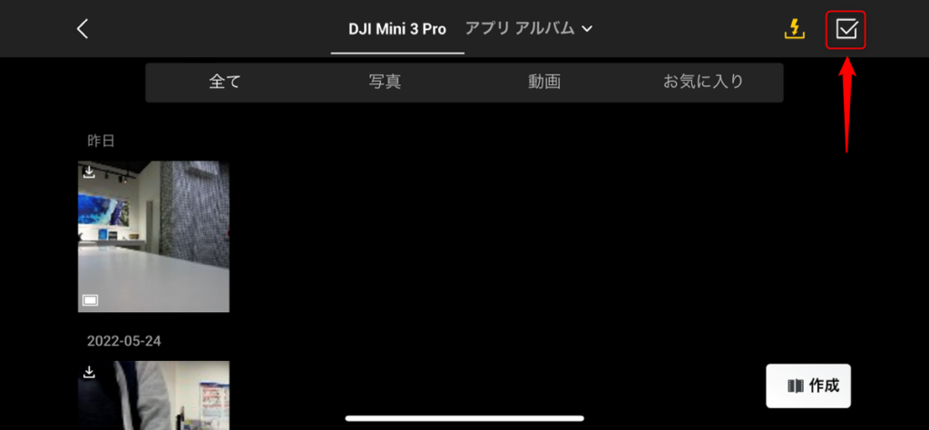 DJI Fly 上でアルバムを開いたら、右上のイナズマのようなアイコンをタップします。