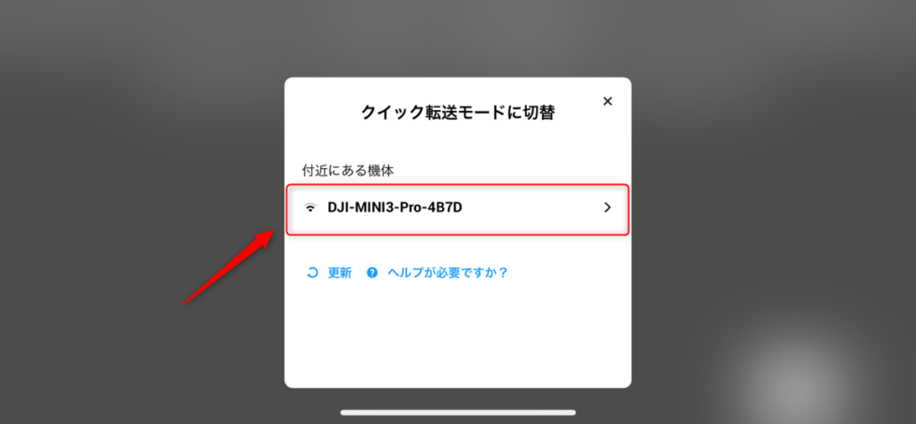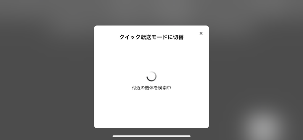 すると、画面に「クイック転送モードに切替」と表示され、付近の機体を自動で検索し始めます。電源の入っている Mini 3 Pro を近くに置いておきましょう。