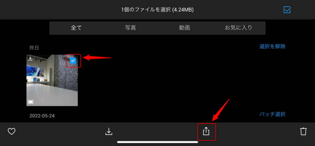 転送したい画像・動画データを選択したら、続けて画面下側の「↑」をタップします。選択したデータがスマートフォン・タブレットに転送されます。以上で手順は完了です。