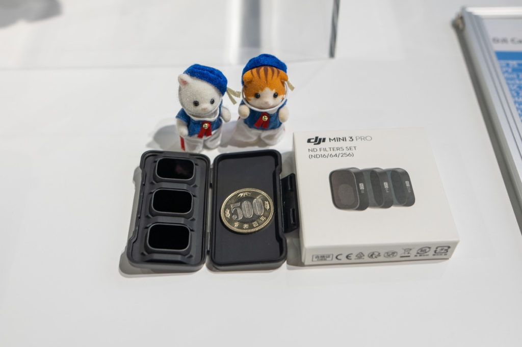 こちらがDJI純正品の Mini 3 Pro 専用のNDフィルター です。500円玉と比べても、小さくて可愛らしいサイズ感になっています。今回のNDフィルターの濃度は16/64/256の3種類のセットで、ND16ならレンズに入る光量を1/16に減らしてくれます。価格は3種類セットで税込5,830円です。