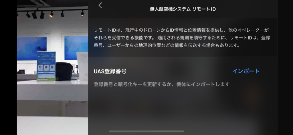 続いてUAS登録番号の[インポート]をタップしてください。ここからドローン登録システムと連携できます。