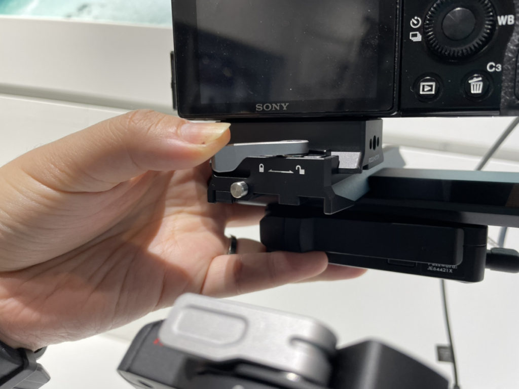クイックリリースプレートを付けたら、カメラを RS 3/RS 3 Pro に載せます。クイックリリースプレートを固定するためのレバーがついていますので、ここもしっかり押し込んで、がっちり固定してください。