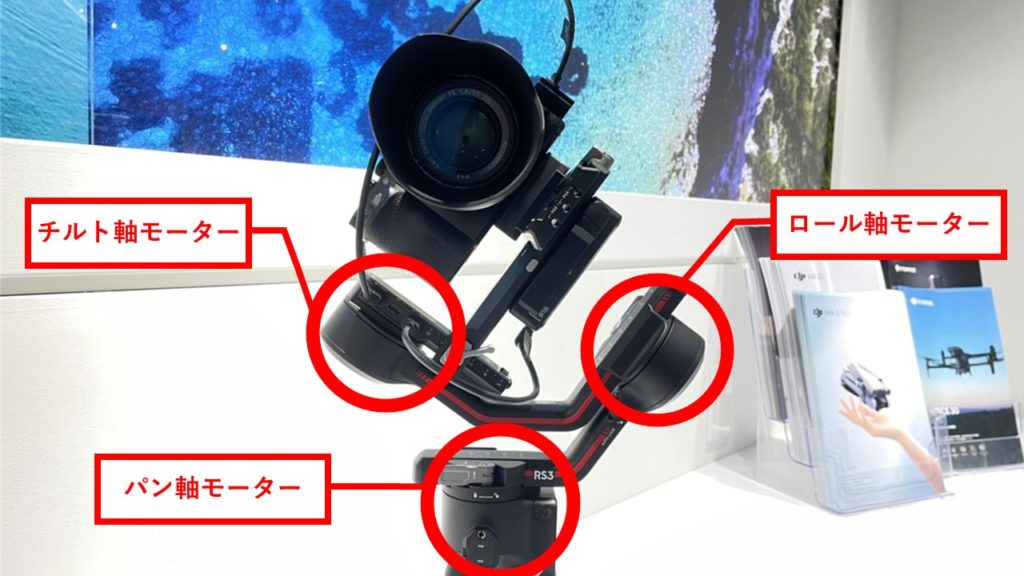電源を入れる前に、モーターのロックを解除します。RS 3/RS 3 Pro には3つのモーターがあり、それぞれチルト軸、ロール軸、パン軸を支えています。以下の写真はモーターがロックされた状態です。