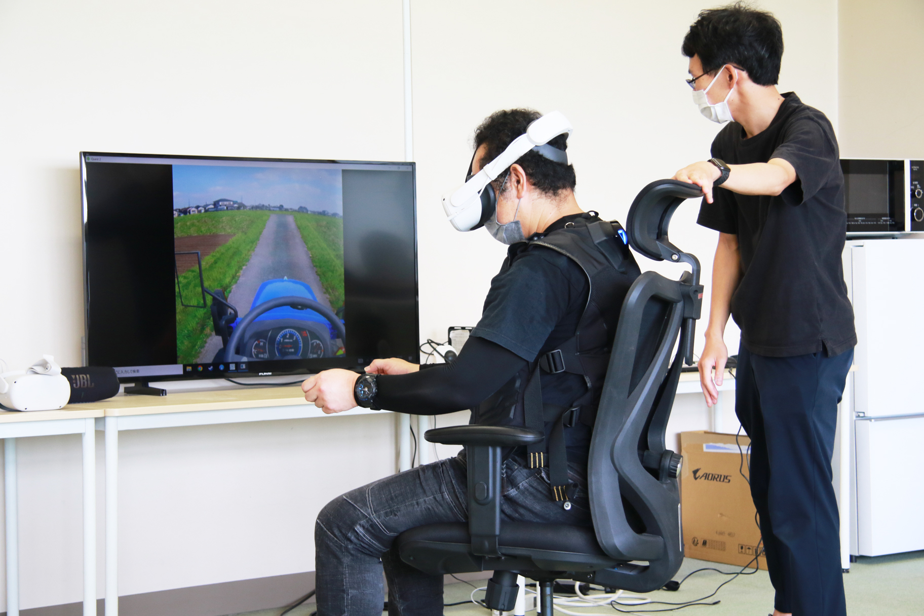 画面には一人称の運転席視点が見えていますが、ゴーグルを付けている利用者にはよりリアルに映っています。いつもトラクターを使用している方には不要かもしれませんが、これから運転される方のシミュレーションや、社内講習などにも使えますよね。適正でない運転をすると脱輪して事故を起こすところまでプログラムされているので、熟練者にとっても改めて危険性の再確認ができ、事故防止に繋がります。
