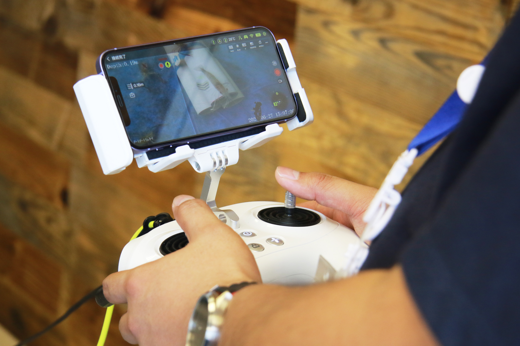 水中ドローンの操縦機。空のドローンと操作性はほとんど変わりません。空のドローンが飛ばせれば、水のドローンも大丈夫です!
