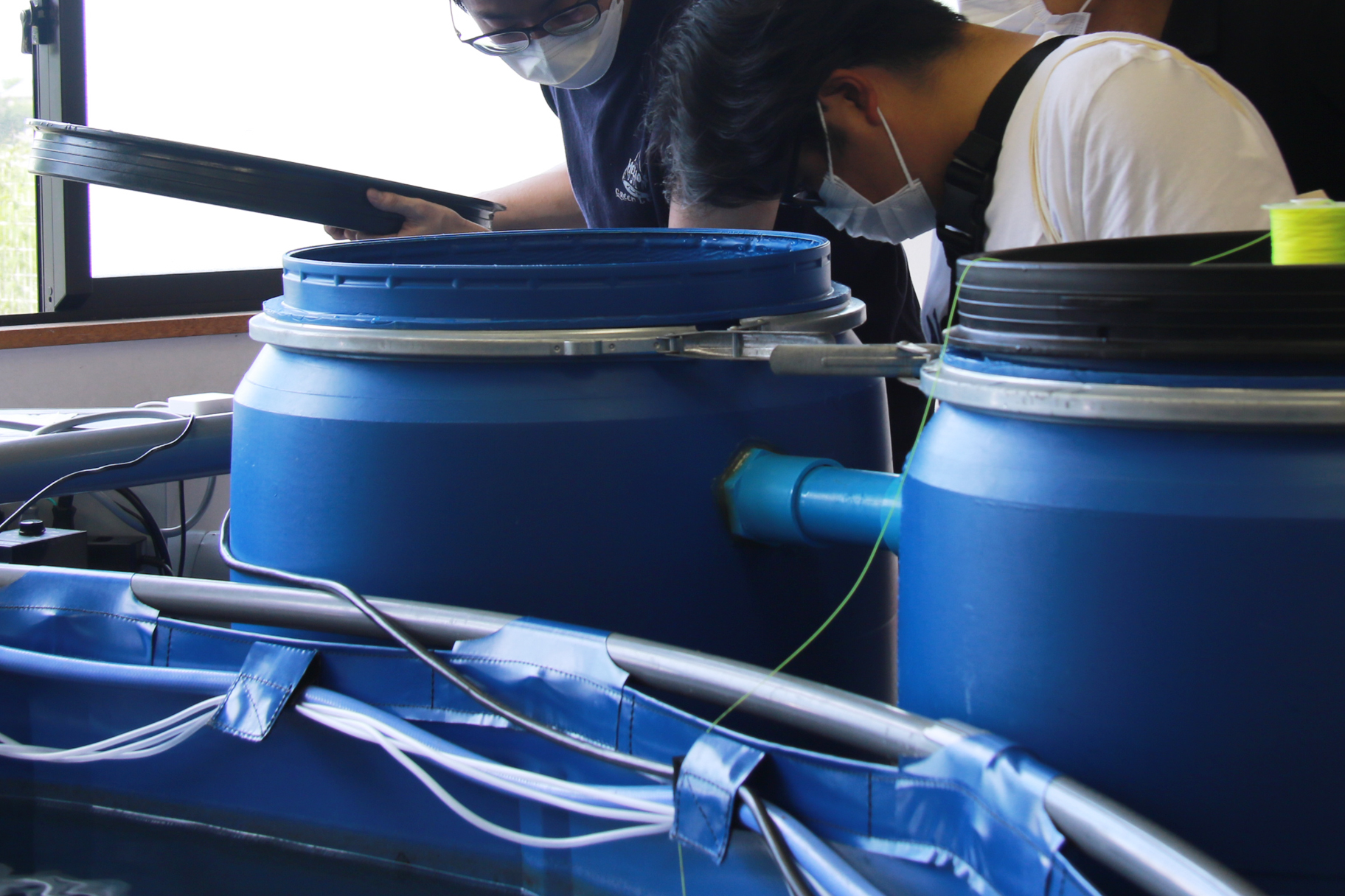 ろ過装置と室内の大きなプール(生け簀と言っていいのでしょうか?)で完全に室内での養殖に成功しています。