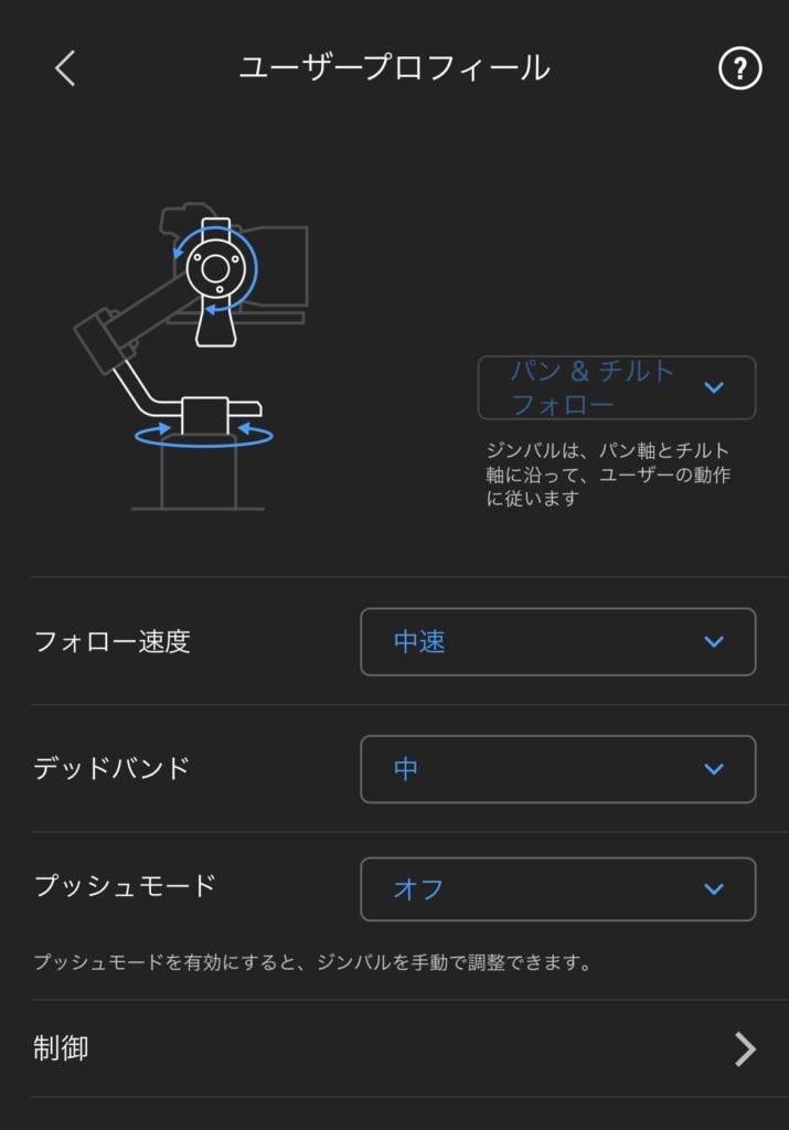 フォロー速度、デッドバンド、プッシュモードの調整ができます。
