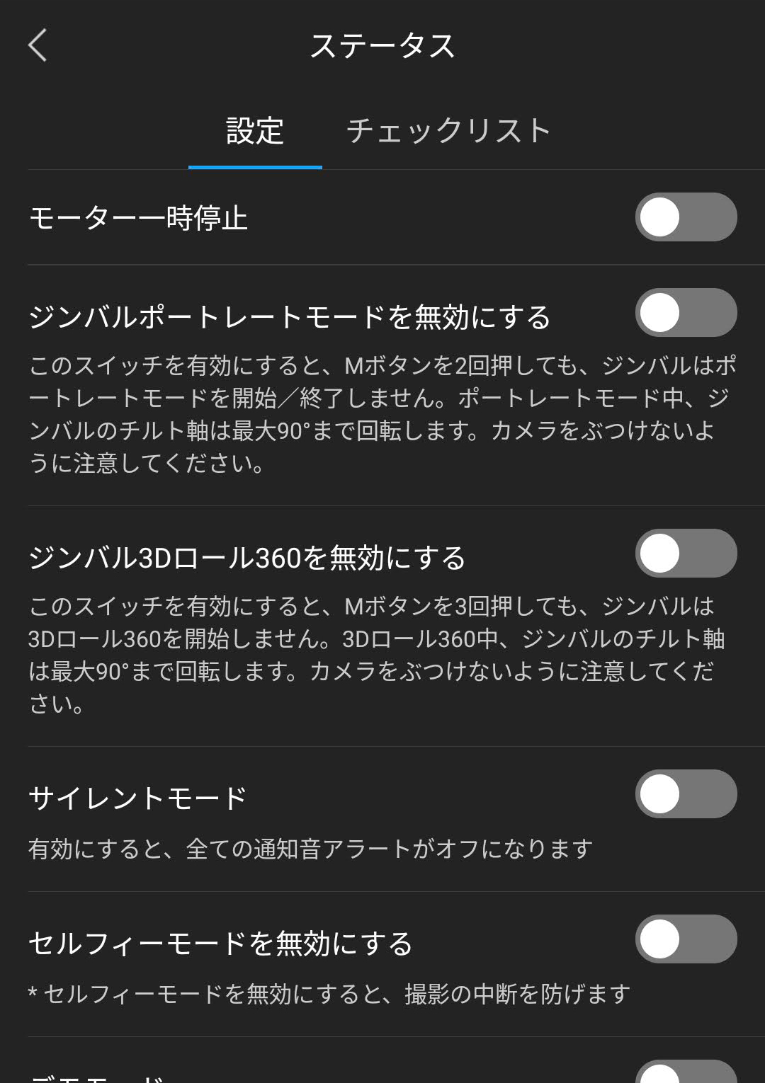 右のタブの「チェックリスト」ではジンバルとのBluetooth接続ができているか、カメラのシャッター制御ができているかを確認することができます。