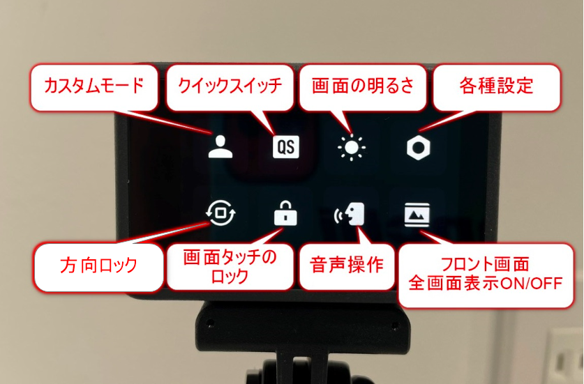 こちらは映像プレビュー画面で、上から下にスワイプしたときに出てくる各種設定アイコンの説明です。