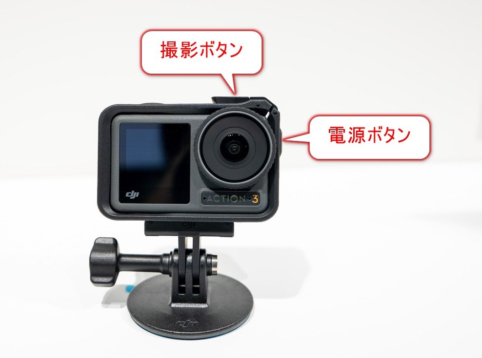 DJI Osmo Action 3 には2つの物理ボタンがあります。本体上にあるのが撮影ボタンで、側面にあるのが電源ボタンです。