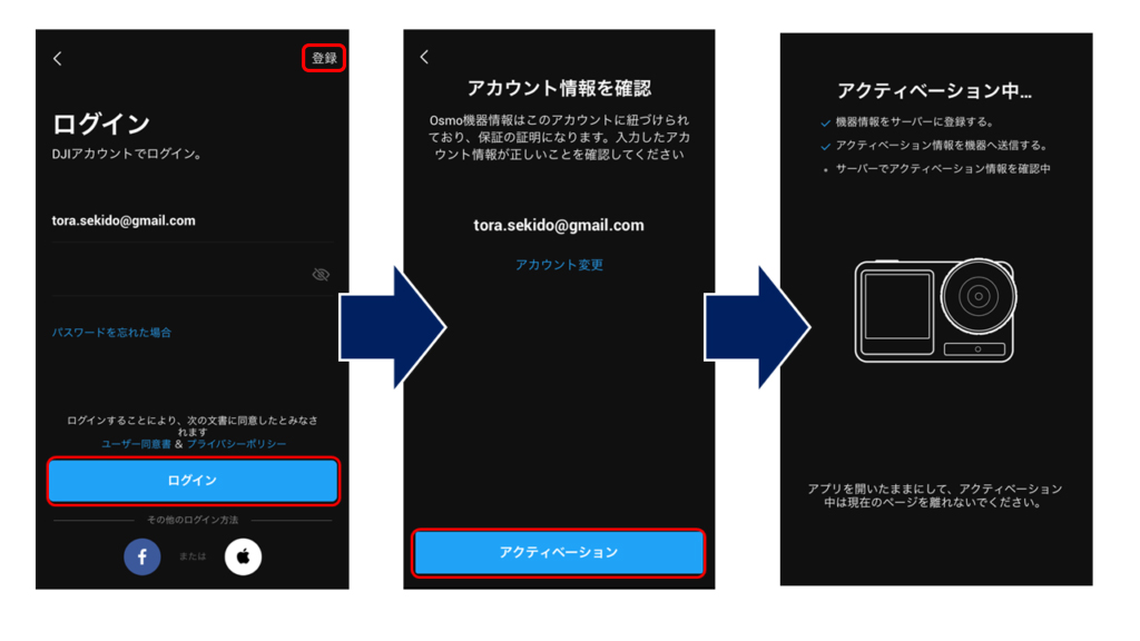 ログインが済んだら[アカウント情報を確認]の画面でメールアドレスの間違いがないかよく確認してから、[アクティベーション]をタップすると、アプリが自動でアクティベーションを行います。