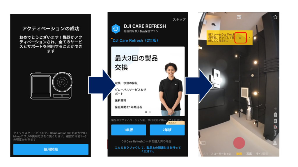 しばらく待つと、Osmo Action 3 のアクティベーションが完了します。[使用開始]をタップすると DJI Care Refresh の画面に進みますので、コードの紐付けや新たに加入したいという方は画面の指示に従ってください。不要な場合は右上の[スキップ]をタップし先へ進みます。