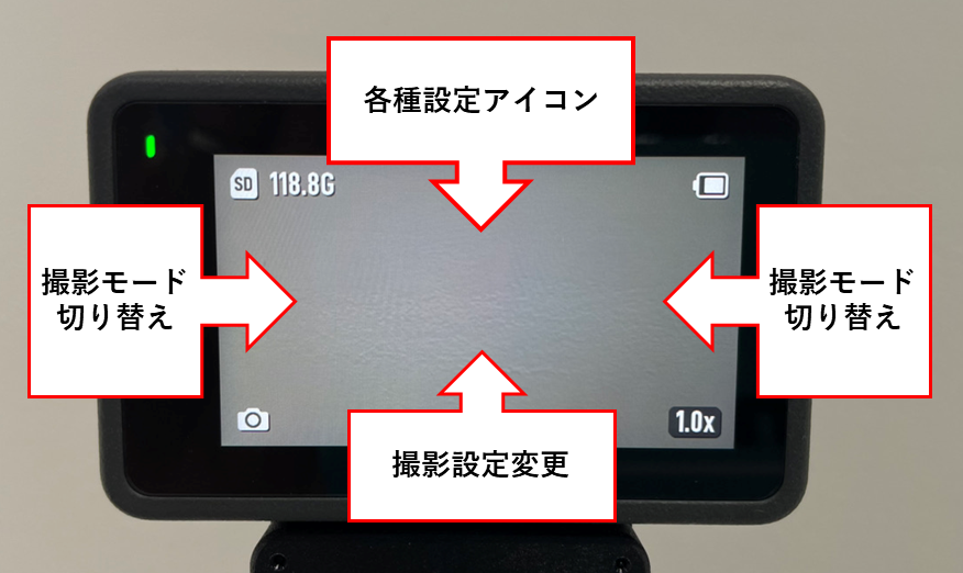 各種設定:より細かい設定画面に入ります。スナップショット、1画面プレビュー(フロント画面を真っ暗にする)、音声操作、スキューバダイビングモード、無線接続(Wi-Fi設定)、動画圧縮(H264 or HEVCを選択)、音(操作音の大きさ)、グリッド線、ちらつき防止、名称設定管理(保存するフォルダ・ファイル名称の設定)、録画時画面オフ、自動電源オフ時間、LED(点灯させるか否か)、水平キャリブレーション、言語、日付・時刻、microSDカードのフォーマット、工場出荷時の設定に戻す、機器情報(シリアルナンバー、ファームウェアバージョン、クイックスタートガイドなど)、コンプライアンス情報の閲覧などの項目を確認および設定することができます。