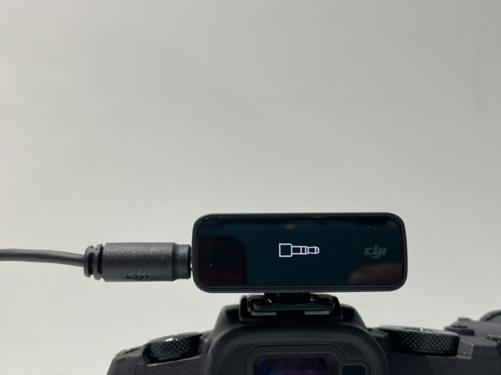 接続がうまくいくと、レシーバーの画面にプラグの絵が2~3秒ほど表示されます。あとは DJI Mic のトランスミッターを演者さん(しゃべる人)に付けてもらい、カメラのRECボタンを押して撮影をするだけでマイクが音声を拾って収録することができます。