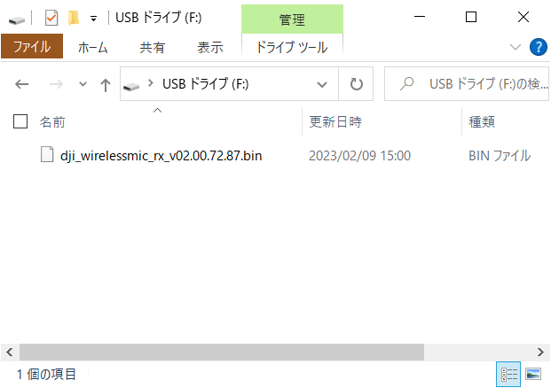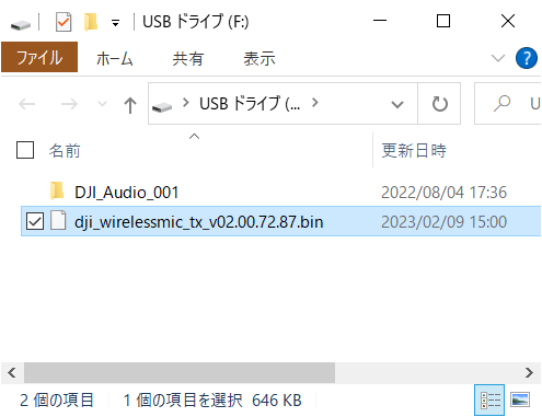 では、レシーバーをPCに接続して内部ディレクトリにアクセスしましょう。1番上の階層に今回ダウンロードした 「dji_wirelessmic_rx_v02.00.72.87.bin」ファイル をコピーします。