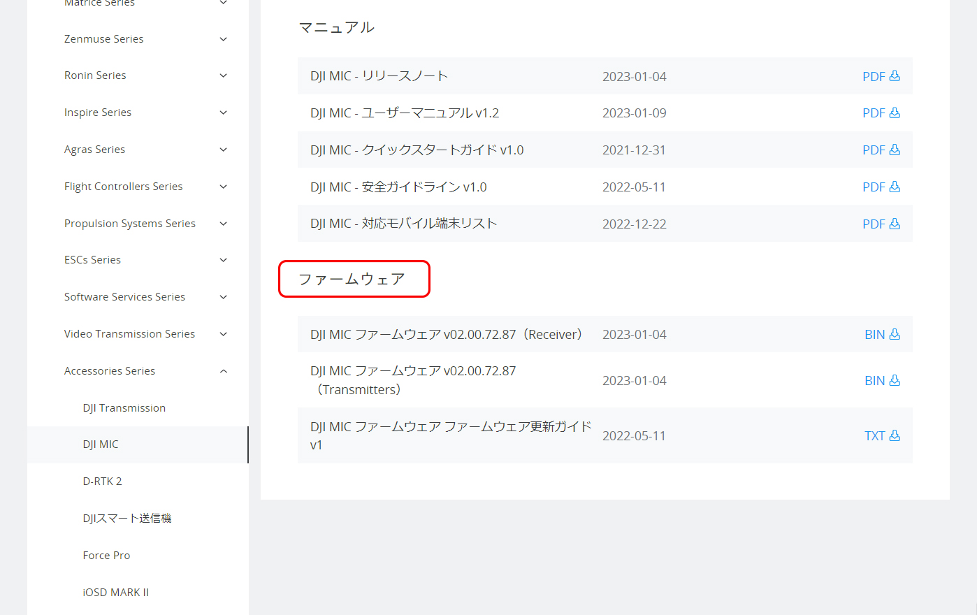 それでは、先述の手順に従って実施してみましょう。まずはファームウェアのデータをDJI公式サイトからダウンロードしてください。ファームウェア → [BIN]と書かれているファイルをクリックすれば、ファイルをPCにダウンロードすることができます。