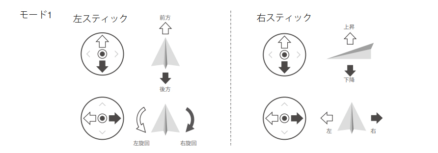 モード1は、左のスティックで機体の前後移動と旋回、右のスティックで上昇下降と左右の移動ができるようになっております。このモード1はラジコンヘリなどを操作方法と似ているため、ラジヘリ経験のある方にはおすすめの操作モードです。