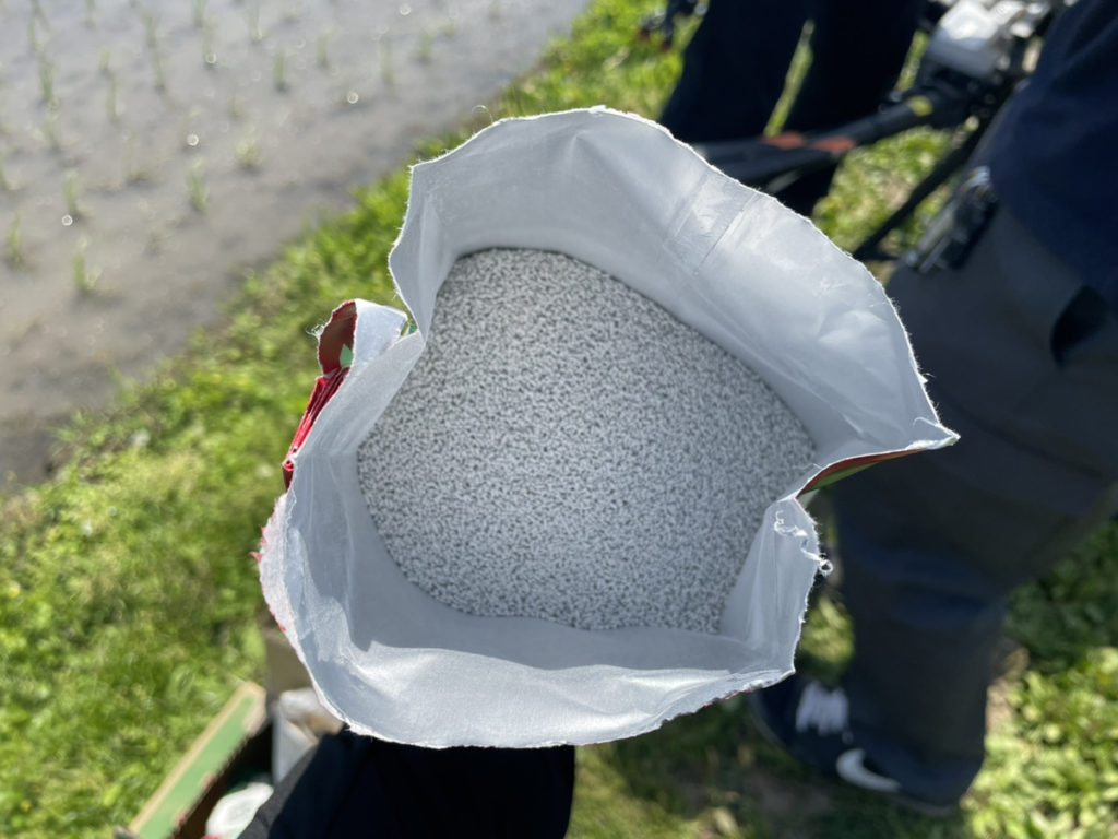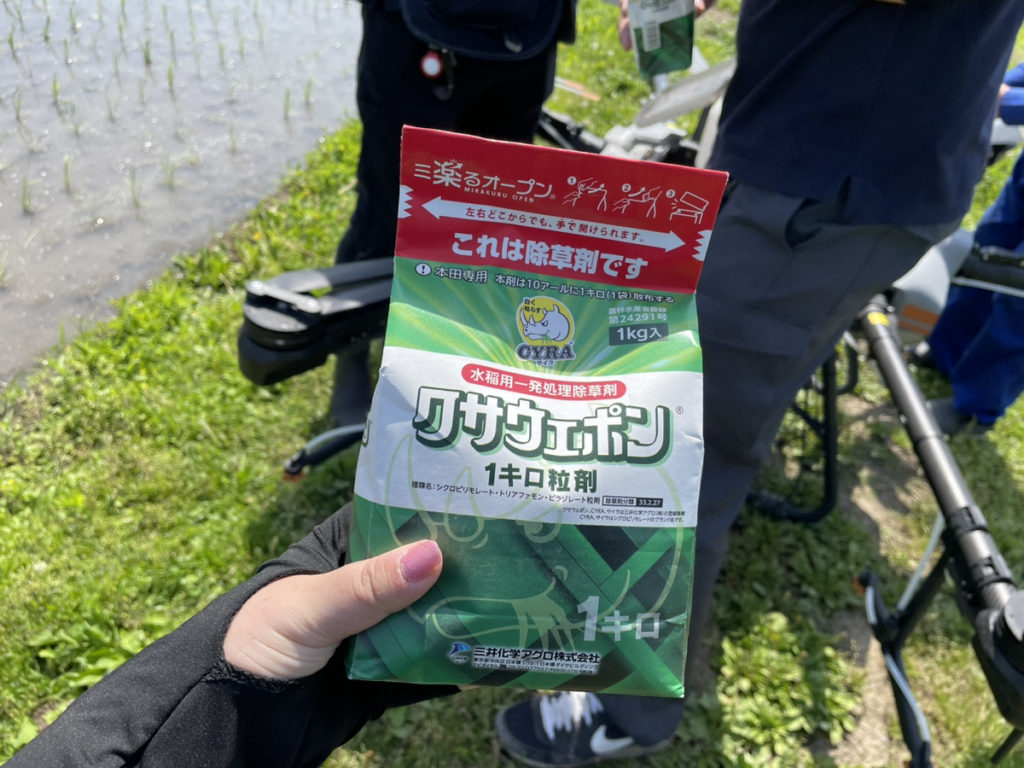 今回はドローンを使い、 クサウェポン という除草剤を水稲に撒きます。パッケージの形は小麦粉に似ていました。要らない雑草を、1本残らずせん滅してくれそうな名前ですね。