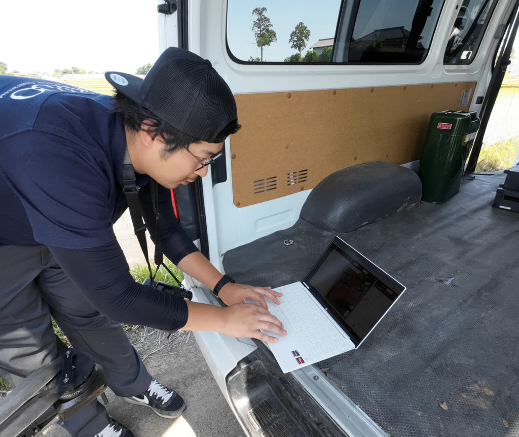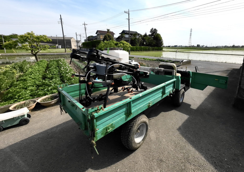 あぜ道が少々コンパクトでしたので社用車のハイエースが入れず、運搬車をお借りしてドローンを運ぶことになりました。オープンカーが大好きな私は、親しみを込めてこの車を「農道のロードスター」と勝手に呼んでいます。(笑)