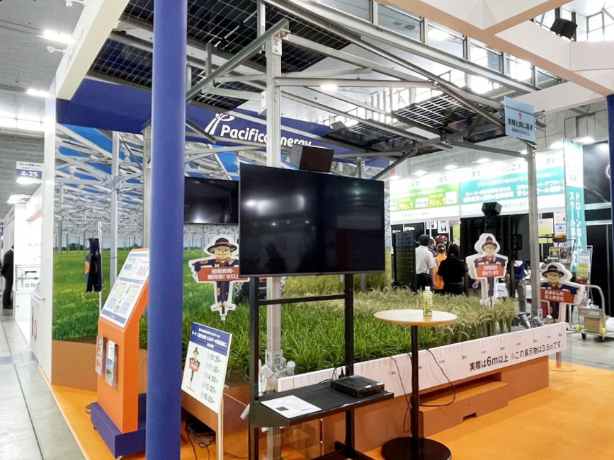 屋内展示場には最新ドローンや、ハウスの遠隔管理のためのカメラ技術やロボット技術がずらっと並び、屋外展示場にはトラクターや自動操舵システム、ソーラーシェアリングを意識した圃場設備などが展示されていました。