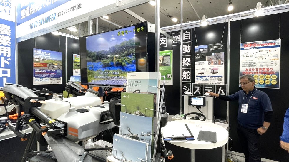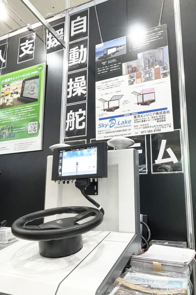 入場受付を済ませた先、入り口を入ってすぐ右手にブースを構えDJI農業ドローンやFJD農機自動操舵システムを展示していたのが、東洋エンジニア株式会社のブースです。