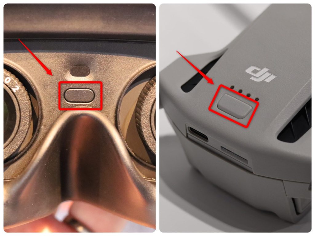 まずはドローン本体とゴーグルをリンクさせます。両方の電源を入れ、ゴーグルのリンクボタンを長押し → 機体の電源ボタンを長押しします。