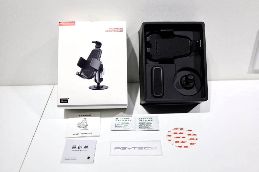 まずは商品のセット内容を紹介します。箱を開けると、ホルダー本体のほかに、説明書、予備の3M両面テープ、アルコール綿、PGYTECHロゴステッカーなどが同梱されていました。両面テープの粘着を長持ちさせるには、接着させたい場所をしっかりアルコールで拭いて脱脂することが大切といわれています。脱脂用のアルコール綿も一緒にセットになっているのは、とても親切ですね。