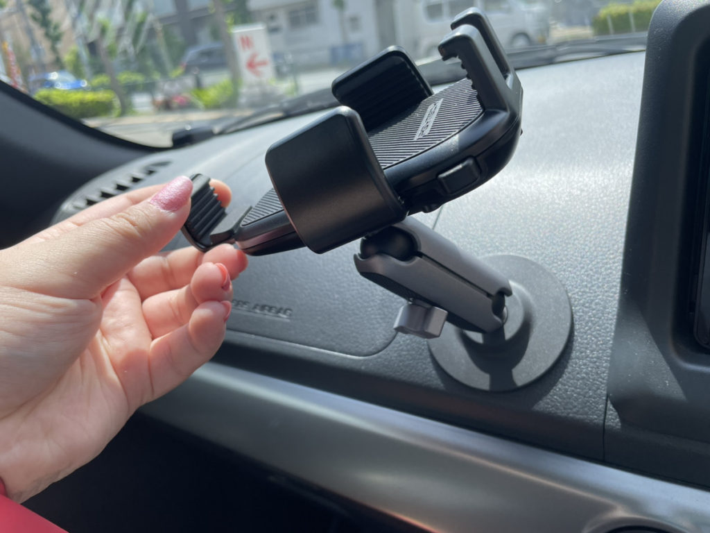 本体はホルダー部分・中間アーム・ベースに分かれていますが、車に乗り込む前に組み立ててしまってOKです。吸盤タイプやエアコンの吹き出し口に取り付けるタイプと違い、基本的には最初に貼り付けた位置で据え置きとなりますので、実際に使用予定のスマホを載せながら、お好みの位置を確認するといいでしょう。今回はカーナビの左横に取り付けました。取り付けはテープの剥離紙を剥がして接着するだけなので、とても簡単です。ホルダーとベースの間はボール状のジョイントを採用しているので、可動範囲が広く、好きな角度で固定することができました。自由度が高いのも推せますね。