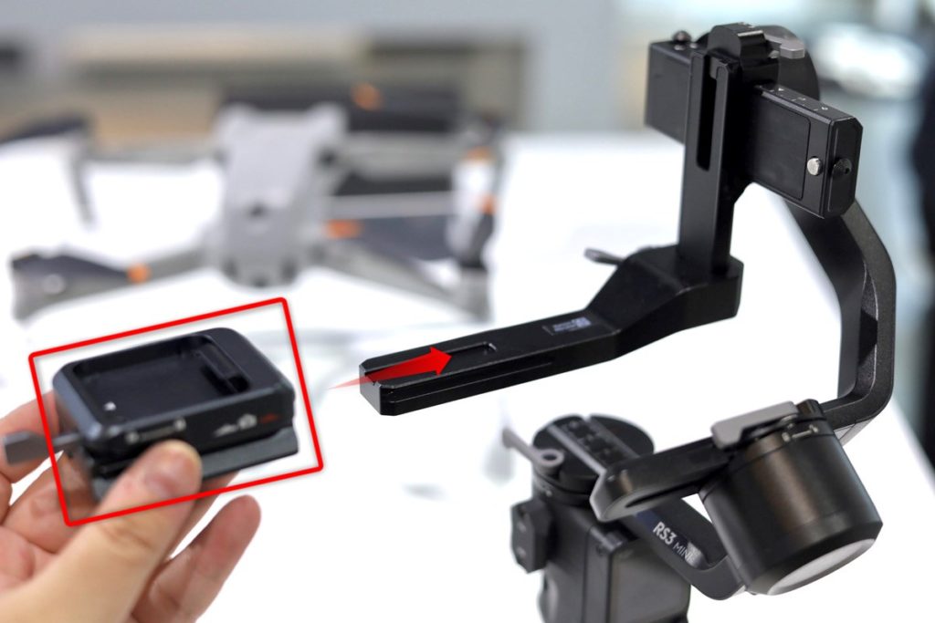RS 3 Pro に取り付けてみます。基本的な取り付け方は RS 3 も同じです。クランプをスライドさせて、スタビライザーの下部クイックリリースプレートにはめ込みます。