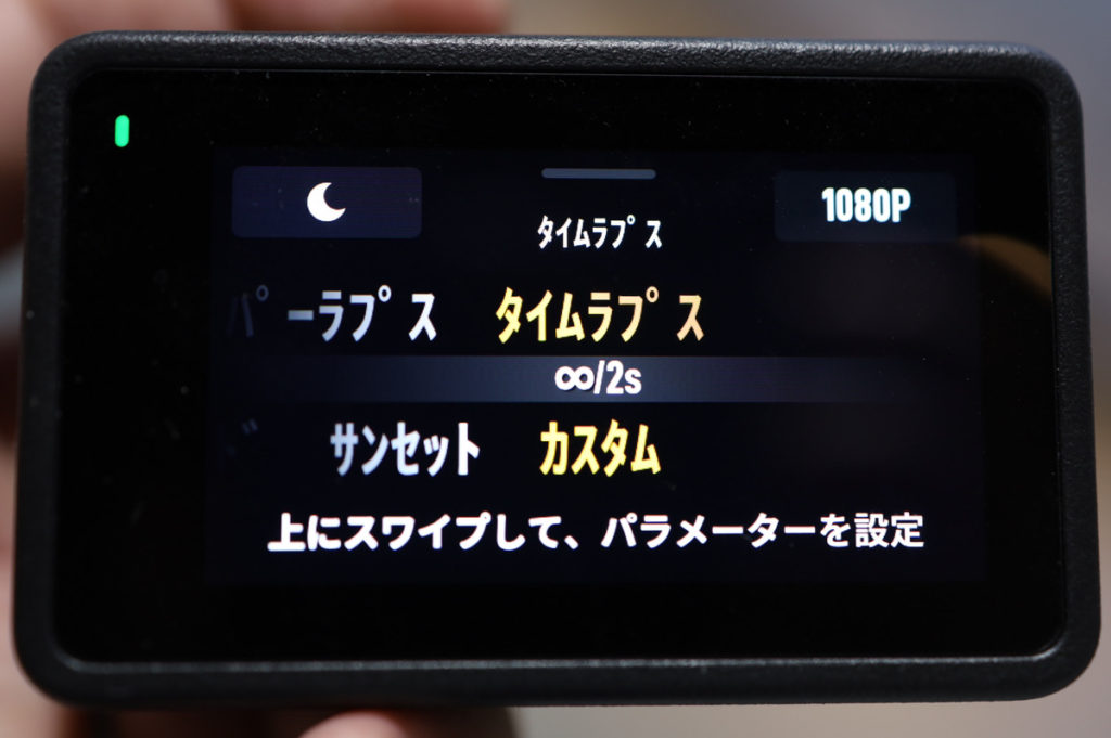 タイムラプスを選んだら、画面を下から上にスワイプしてメニューを出し、[ カスタム ]を選びます。さらに画面を下から上にスワイプすると、撮影間隔秒数や、撮影し続ける時間を設定することができます。