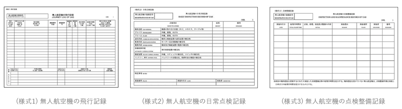 飛行年月日、飛行させたものの氏名、飛行概要、離着陸場所・時刻、飛行時間、不具合及びその対応などを記載・日常点検記録:
