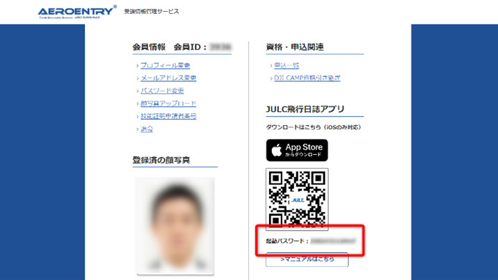 初回ログイン時にはパスワードの入力が求められます。このパスワードはJULC会員システムのエアロエントリー社「受講情報管理サービス」内に記載のあるパスワードです。