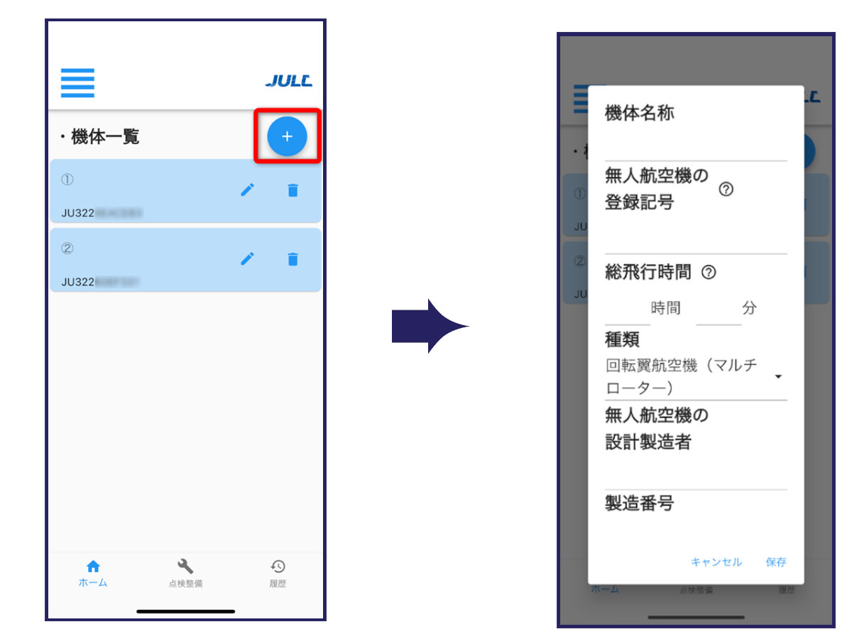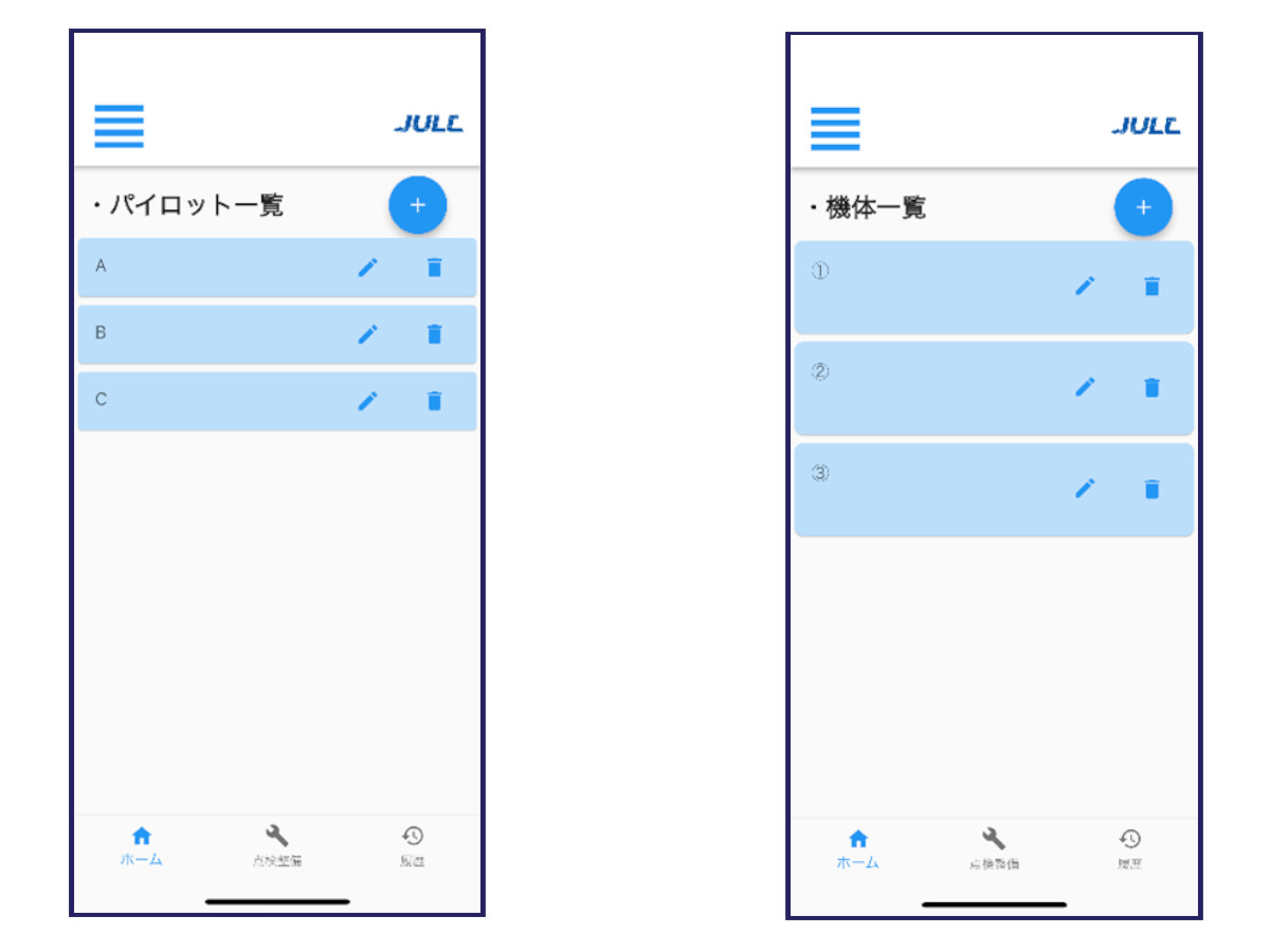 アプリを使用するには、まずパイロットと機体の登録を行います。ホーム画面左上のタブをタップすると登録画面が出てきますので、必要事項を入力してください。