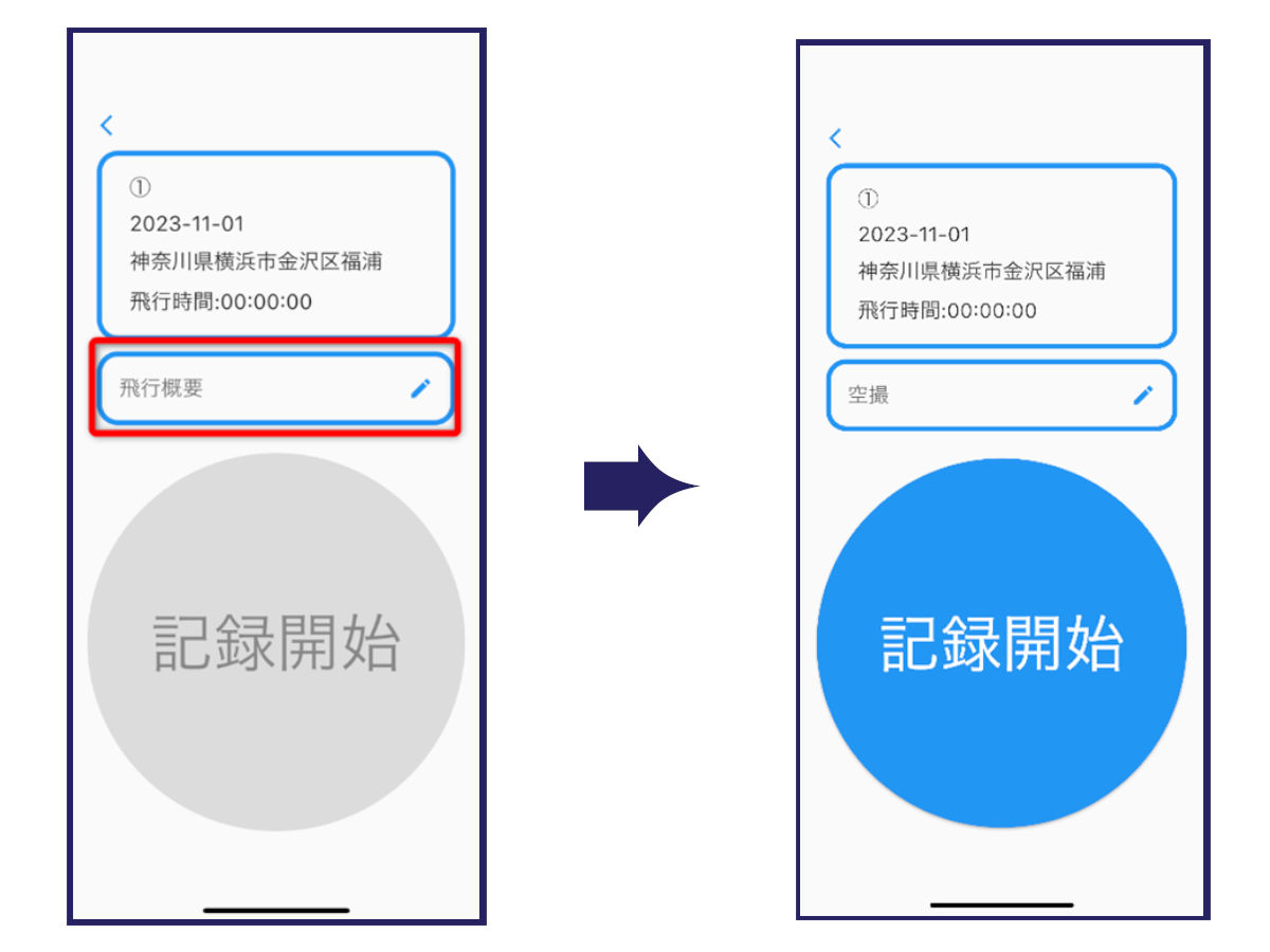 続いては飛行記録の作成です。「飛行概要」欄に飛行の目的を入力し、[準備完了]→[記録開始]をタップすると、自動的に飛行時間のカウントが始まります。また飛行する場所は、端末の位置情報を利用して自動的に記録が行われます。