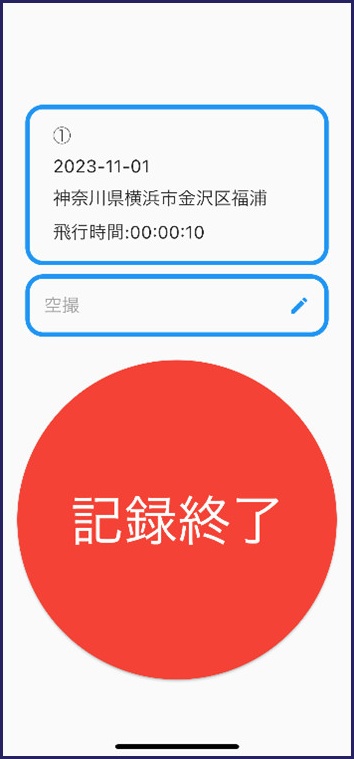 そして、飛行が終了して着陸した後に[記録終了]を押すことで、飛行時間のカウントが終了します。飛行開始後は終了ボタン押し忘れ防止のために5分おきにビープ音が鳴るので安心です。つい漏れてしまいがちな離陸時刻・着陸時刻の確認ですが、このアプリを使えばもう漏れてしまうことはありません!
