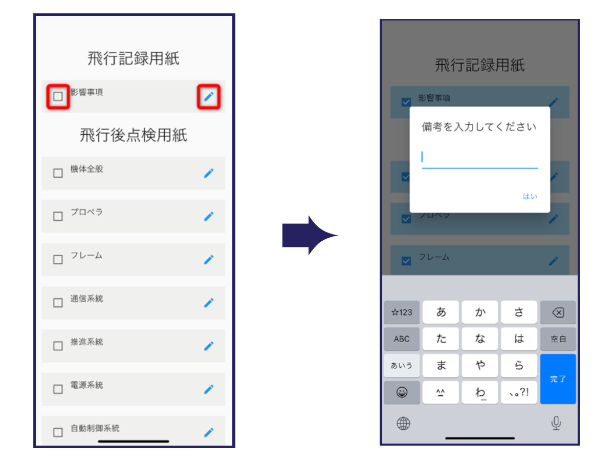 飛行記録が終了すると、影響事項及び飛行後点検の入力画面に移行します。衝突、破損、通信異常などの飛行に影響のある事項が発生した際には、右側のペンのアイコンをタップし、影響事項を入力します。飛行後点検の入力は、飛行前点検の入力と同じように行います。それぞれの項目について点検を行い、問題がなければタップして✓を付けます。異常がある際には右のペンのアイコンをタップし、異常の内容を入力します。