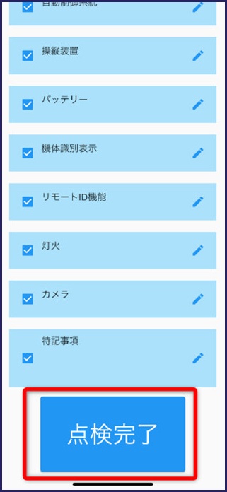 すべての項目の点検が完了し[点検完了]を押すと、飛行記録の入力画面に移行します。