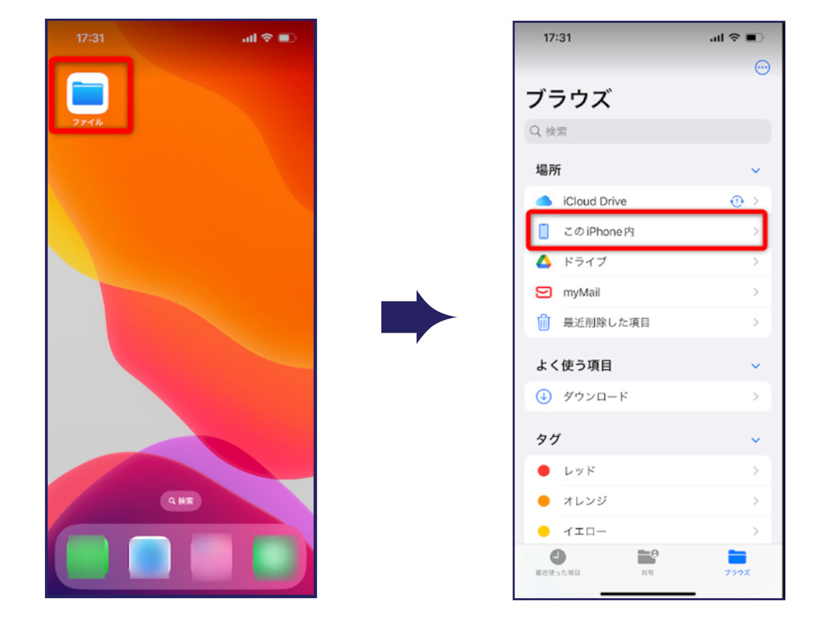 保存先はiOS標準アプリの「ファイル」です。「ファイル」>「この iPhone 内」>「JULC飛行日誌」と進んでいくと保存したcsvデータにアクセスができます。