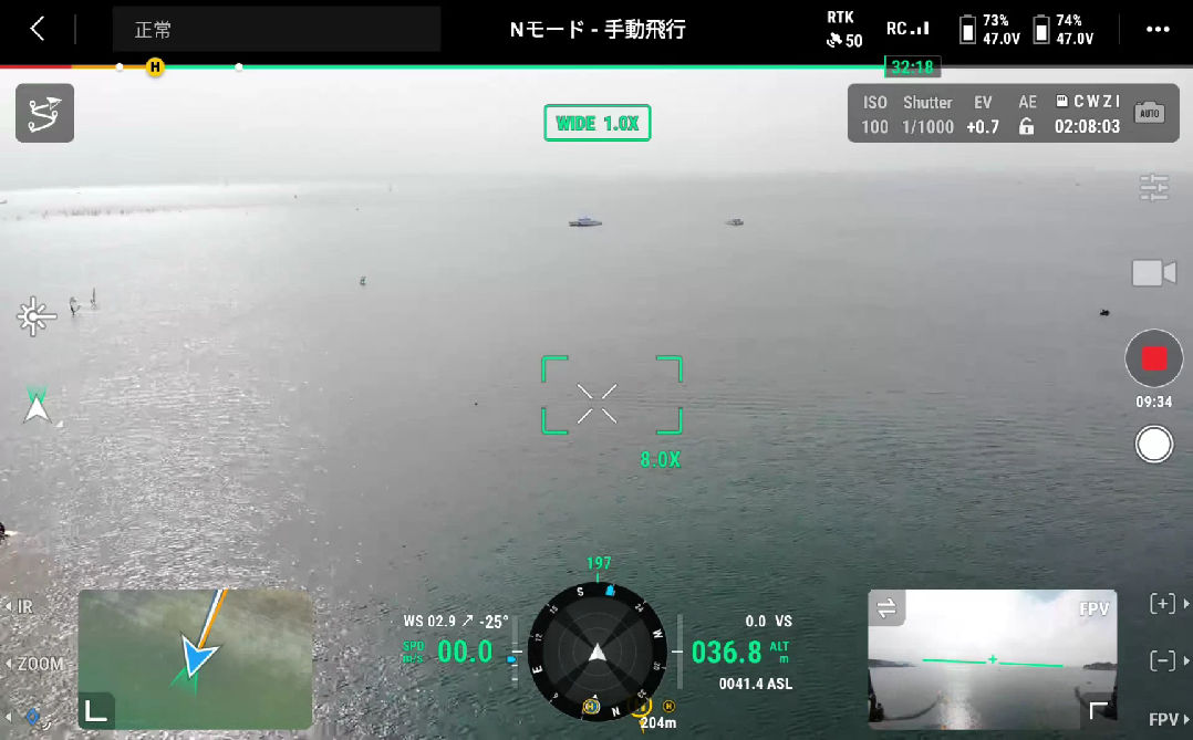 物資輸送の船やボートとドローンの距離は約150mあり、安全面も考慮し遠くから撮影を行いました。