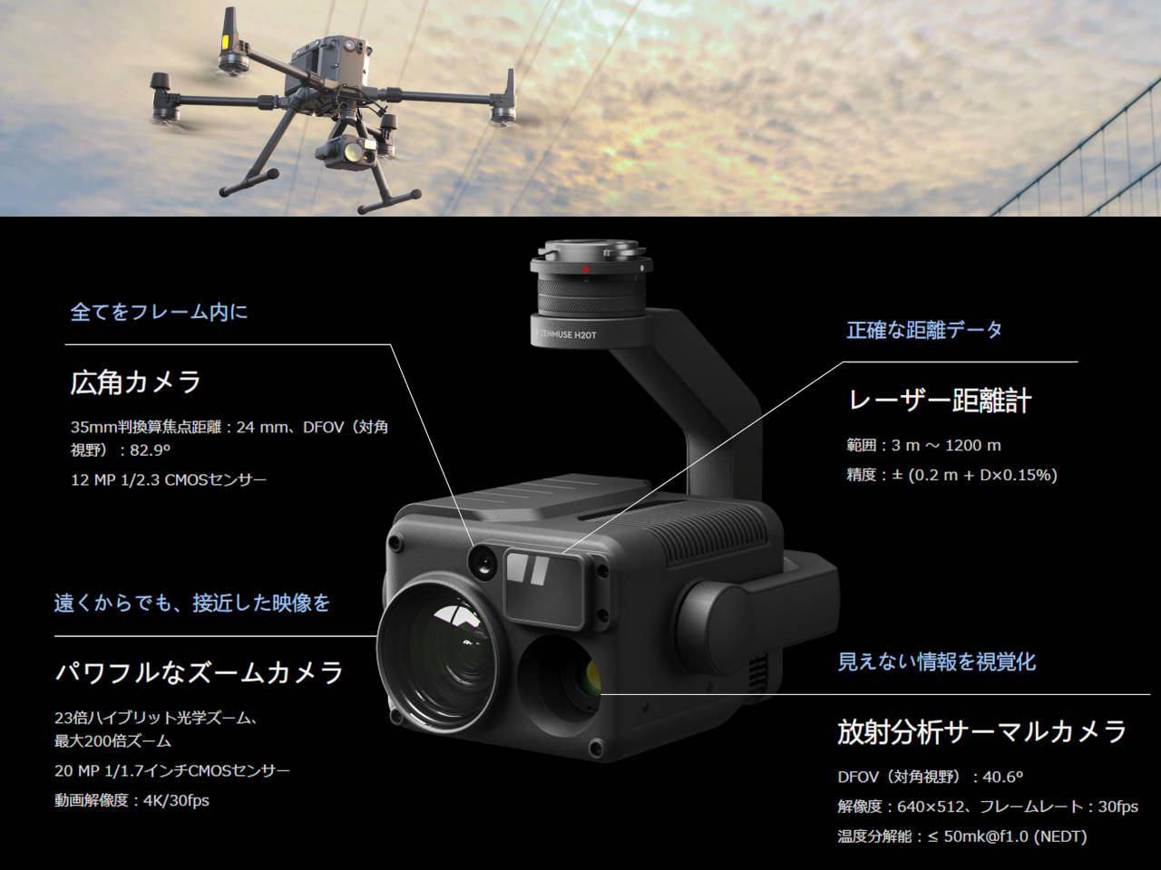 撮影は Matrice 350 RTK+Zenmuse H20T の可視光カメラを使用しました。Zenmuse H20T のズームカメラは23倍ハイブリット光学ズームを搭載し、最大200倍ズーム、20MP対応1/1.7インチCMOSセンサーで4K/30fpsの高解像度動画が撮影可能と、性能だけ見てもハイスペックなカメラとなっております。