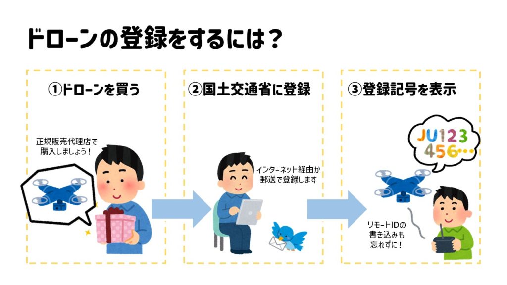 要は100g以上の重さのドローンを外で飛ばす場合、「リモートID」をつけた上で「国土交通省に登録」を済ませる必要があるということです。国土交通省なんて言われると難しそうに聞こえますが、実は通販の会員登録とさほど変わりません。(個人の感想です。笑)とりあえず、実際にやってみましょう。